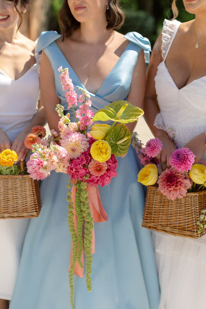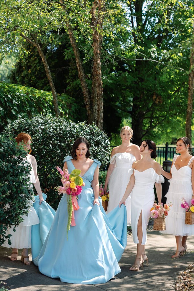 The fashion edit was all about a fresh perspective. The bride stunned in a powder blue gown from Lace Bridal Couture, a bold yet romantic departure from tradition that felt effortlessly on trend. Her bridesmaids, dressed in crisp white from Lulus Weddings, offered a timeless contrast that tied the look together with modern ease.
