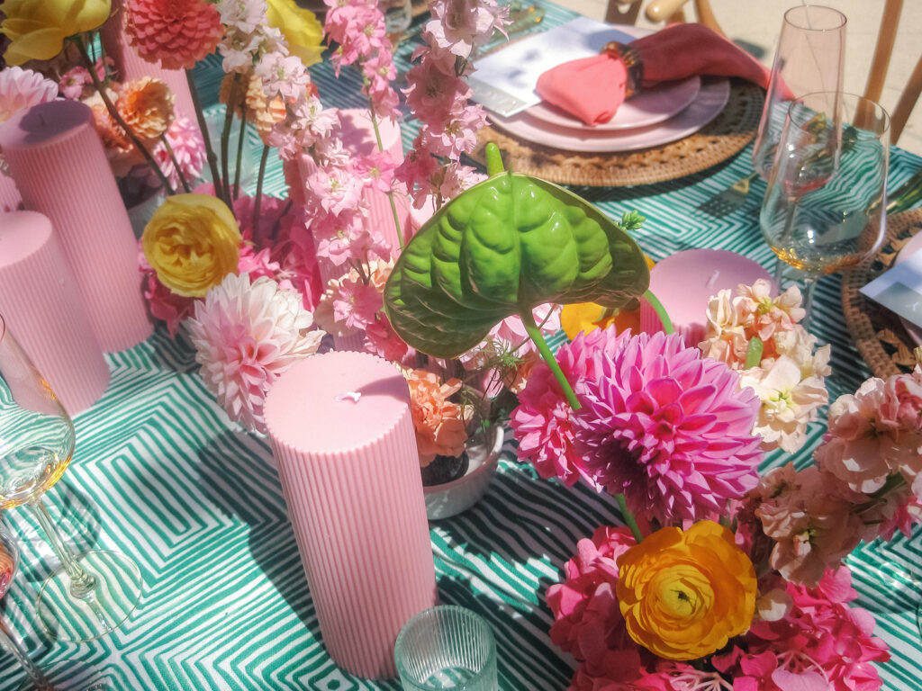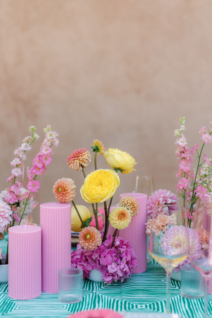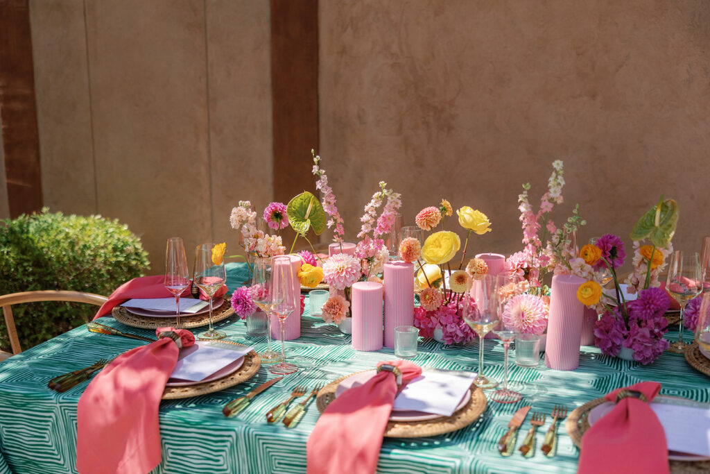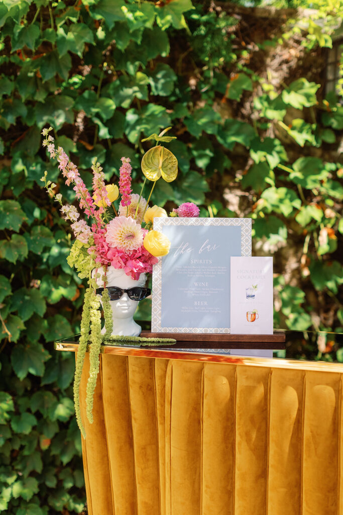 The design embraced saturated summer tones: sunny yellows, punchy pinks, and lush greens, layered against natural textures of rattan, linen, and marble. A mustard velvet bar and a “cool girl” floral moment (complete with a bust vase wearing sunglasses) greeted guests with personality and charm.