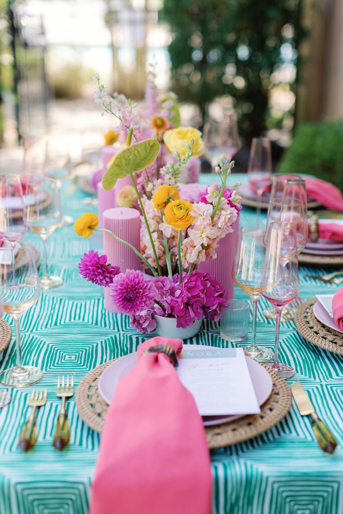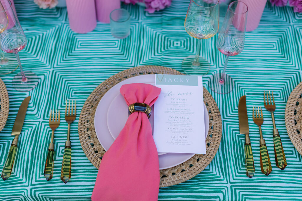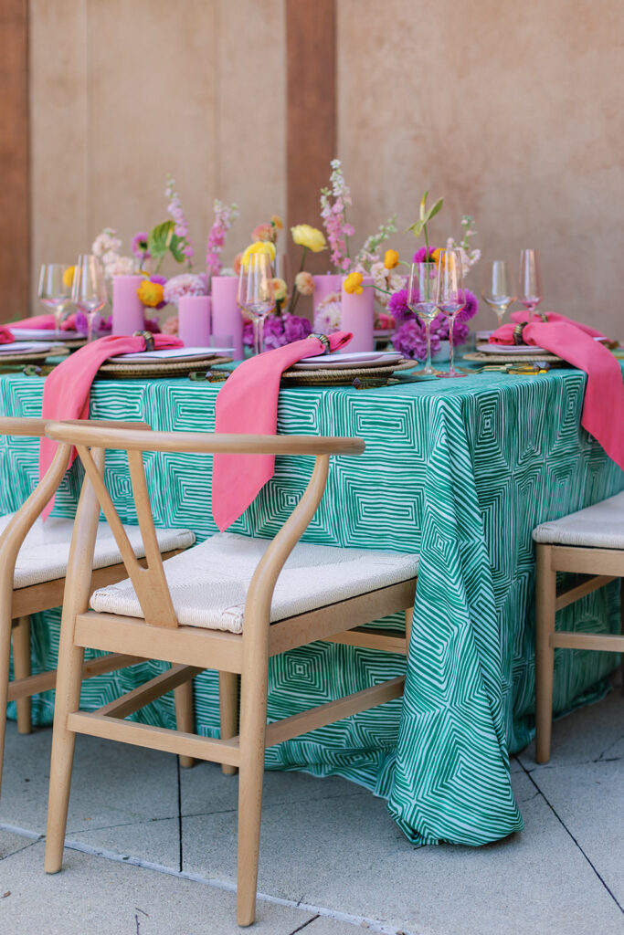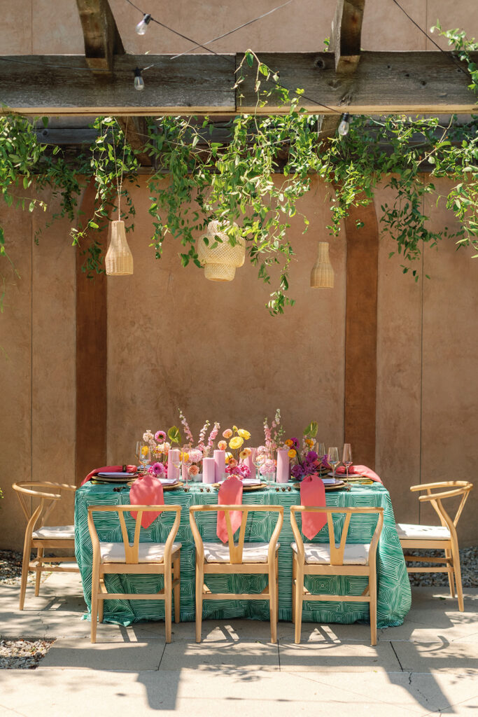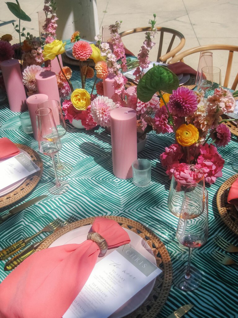 The tablescape was an ode to modern Mediterranean living. Patterned linens from BBJ La Tavola, airy wishbone chairs, and playful coral napkins that popped against lush, sculptural blooms by Essentia Blooms. Overhead, woven pendants and greenery created a canopy that felt like a chic Italian courtyard.